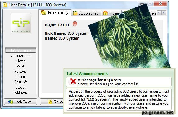 Абонент ICQ Systems с номером 12111, наделавший столько шуму среди клиентов популярного сервиса обмена сообщениями, оказался изобретением администрации ресурса. Информация об этом была размещена на официальном сайте компании спустя несколько дней после того, как в Сети разгорелись ожесточенные дебаты о природе загадочного пользователя. Намерения были благими: разработчики проекта хотели облегчить жизнь клиентам, но вместо этого сделали их жертвами спекулянтов. Номер ICQ 12111, внезапно появившийся в контакт-листах абонентов популярной программы обмена мгновенными сообщениями и ее аналогов QIP, Adium, Pidgin и мобильного клиента Jimm оказался изобретением администрации сервиса, сообщает РИА «Новости». Оказалось, что загадочный номер был автоматически добавлен каждому из пользователей в целях модернизации системы.